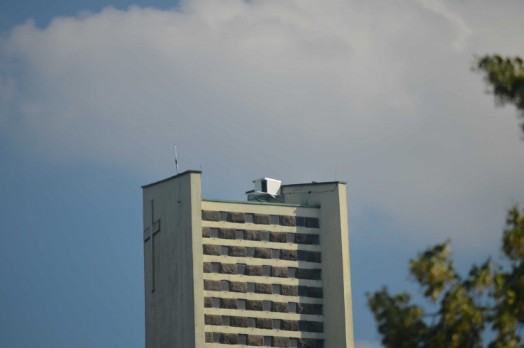 Der obere Teil des Kirchturms der Petruskirche mit Antenne und Falkenkasten auf den die Webcam ausgerichtet ist.